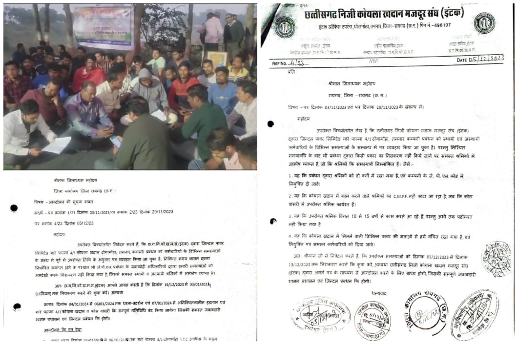 छत्तीसगढ़ निजी कोयला खदान मजदूर संघ (इंटक) टपरंगा द्वारा अपनी मांगों को 5 दिसंबर से 13 दिसंबर के बीच पूरा करने की मांग की गई थी, लेकिन उनकी मांगे आज तक पूरी नहीं हुई, जिस वजह से मजदूर संघ चरण बद्ध विरोध प्रदर्शन शुरू किया है। हड़ताल कर रहे मजदूरों को समझाइस देने के लिए प्रबंधन व पुलिस प्रशासन की टीम आज हड़ताल स्थल पर आई थी, लेकिन त्रिपक्षीय वार्ता के बाद भी संतोष पूर्ण जवाब श्रमिको को नहीं मिला है। मजदूरों का कहना है कि जब तक उन्हें संतोष पूर्ण जवाब नहीं मिलता है, तब तक उनकी अनिश्चितकालीन हड़ताल जारी रहेगी।