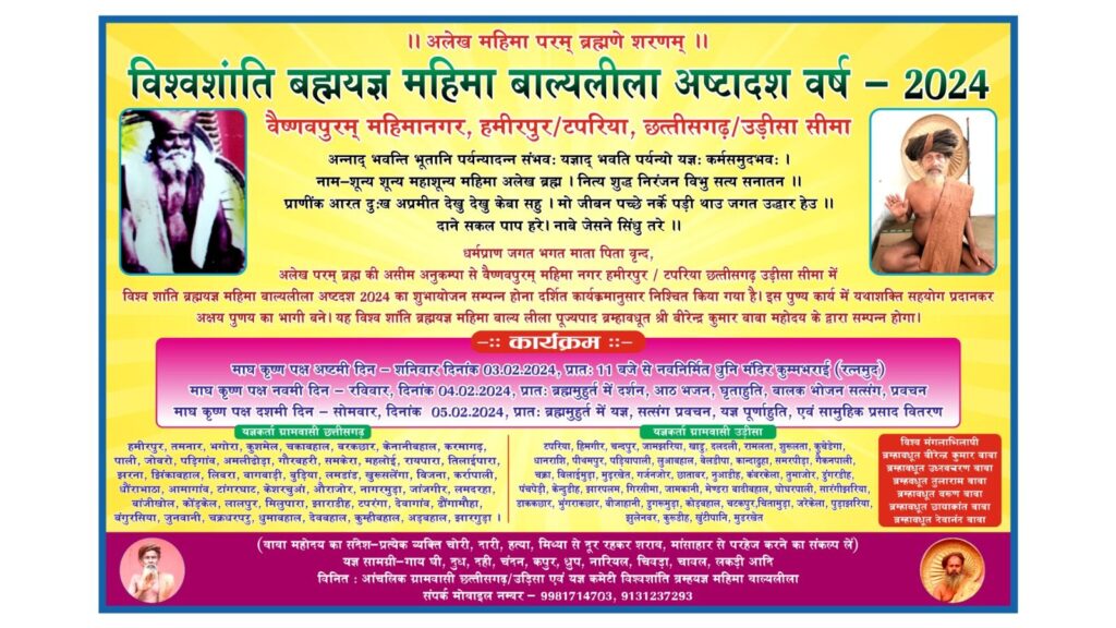 छत्तीसगढ़ उड़ीसा बॉर्डर पर आयोजित होने वाला विश्व शांति ब्रह्म यज्ञ महिमा बाल्यलीला का यह 18 वां वर्ष है, कार्यक्रम का आयोजन जिले के तमनार क्षेत्र में आने वाले गांव के लोगों की सहयोग से होता है। लोगों की भीड़ से कार्यक्रम परिसर मेले के रूप में तब्दील हो जाता है। विगत वर्षों की भांति इस बार भी भजन सत्संग सुनने वह मेला का लुफ्त उठाने के लिए आसपास के लाखों लोगों के शामिल होने की उम्मीद है।